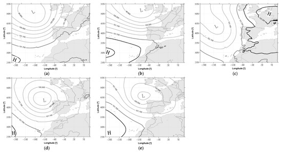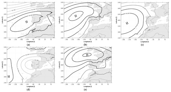 Mean sea level pressure (Pa) contour maps representative of the five most dominant weather circulation types over the region under study for the period from 1980 to 2018: (a) “H”—high pressure (anticyclonic), (b) “NE”—northeast circulation, (c) “N”—north circulation, (d) “L”—low pressure, and (e) “E”—east circulation. The contour lines are gradational by color (grey—low-pressure areas, black—high-pressure areas) and equally spaced by 300 (Pa). The letters H and L in all images identify the center with high- or low-pressure values.