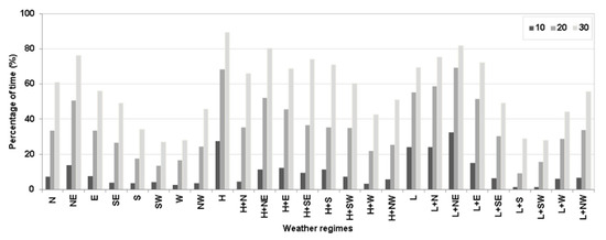 According to Figure 12, the “L+” regimes presented the highest variation in all directions, regardless of the time interval considered and the type of ramp (upward or downward). This result is in line with that observed in previous studies that associated the most significant ramps with atmospheric phenomena such as cyclones and windstorms [11,13]. From Figure 4 it is possible to observe that some of the most critical weather regimes presented a low frequency of occurrence. On the other hand, the “H+” regimes were the ones that present the smoothest variations.