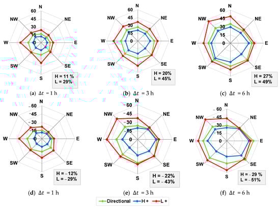 According to Figure 12, the regimes “L + SW”, “L + S”, “L + W”, and “L + NW” presented the highest variations. In these sectors, for equal to 1 hour the variations were above 25%, whereas for equal to 3 h, they reached values from 35% to 45%. For equal to 6 h it is possible to observe that the directional weather regimes “NE”, “E”, and “SE” presented variations above the values observed for the cyclonic weather regime. Indeed, for these directional sectors in the downward wind power ramps case, the values for anticyclonic and cyclonic weather conditions were very similar.