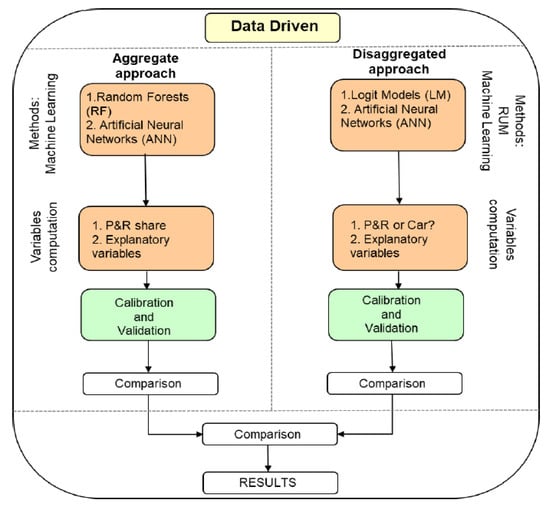Specifically, we focused on the development of Park and Ride models based on machine learning techniques and random utility theory, working with two different approaches. In the aggregated approach, where the output is the P&R share for each traffic zone of the city, results suggest that random forest outperforms ANN in reproducing the P&R share. In the disaggregated approach, ANN shows high accuracy in modeling the behavior of each vehicle, and it is able to perfectly reproduce the choice between Park and Ride and a car. In contrast, the behavioral model based on random utility theory is not satisfactory due to the oversampling of cars with respect to the Park and Ride choices. There are still several research perspectives for the problem, for example, expanding data sources for calibration and validation purposes (e.g., mobile phone data) or testing additional sophisticated machine learning techniques.