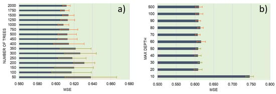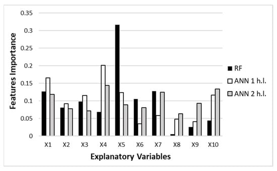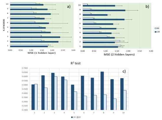 In our study, the RF was built by varying the main model parameters: the number of trees and the maximum depth. Regarding ANN, a multi-layer feedforward neural network has been trained by different algorithms (Levenberg–Marquardt, Bayesian regularization), modifying the activation function between layers (rectified linear unit—ReLU—or logistic regression—Sigmoid), the number of hidden layers, and the number of neurons in each hidden layer. In both cases, the validation adopts out-of-sample data, unseen by the model during the training phase.