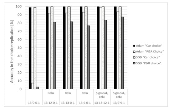 For the disaggregated approach, ANNs have been also considered. However, since the output of the approach is mainly a binary output (car or Park and Ride), a classification with respect to the most complicated regression is required in (1); both a Perceptron network as well as a multi-layer feedforward neural network have been trained. The Perceptron is basically simpler than the multi-layer because it does not adopt hidden layers. As done for the aggregated approach, the ANNs have been trained with different algorithms, activation functions, and numbers of neurons in the hidden layer (the last one only for the multi-layer). Due to the high number of instances in the disaggregated approach (one instance for each FCD trip) the solution algorithms are different with respect to the aggregated approach, i.e., stochastic gradient descent (SGD) and Adam.