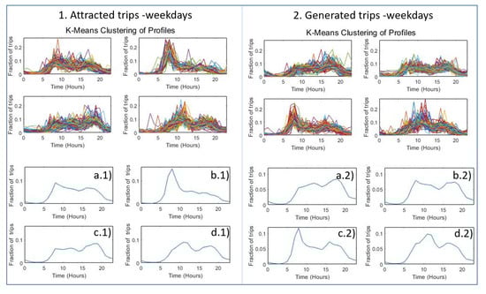 K-means clustering applied to (1) attracted trips and (2) generated trips on the weekdays. Resulting clusters: mixed-use (a1,b2), business/industrial (b1,a2), residential (c1,c2), and commercial (d1,d2).