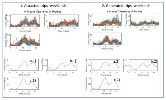 K-means clustering applied to (1) attracted trips and (2) generated trips on the weekends. Resulting clusters: residential (a1,c2), mixed-use (c1,a2), and nightlife and leisure (b1,b2).