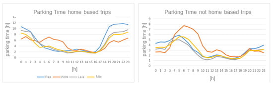 Once the land use was defined, we moved to the computation of the energy demand for each zone of the city as described in Section 3.3. Most of the input required in (7) can be derived directly from FCD; for example, the recharge frequency is a function of the distance traveled (on average, each FCD in Rome travels for about 26 km in a day) and the kilometers to be traveled within the battery life (which are assumed equal to 170 km in this study). Parking times have also been exploited by FCD; these are a function of the land use of the arrival zone and can be different depending on whether the trip is home-based or not, as represented in Figure 9.