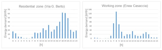 Below, we reported the application of (7) for two specific zones of the city characterized by a different land use: for the considered residential zone, a request of about 60 kWh in the evening was estimated, while in a typical working zone, a peak value of about 120 kWh in the morning time was estimated (Figure 10).