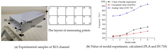 The XLS channel is shown in Figure 3a. The material of the XLS cooling channel used in the experiment was PLA resin (PLA material parameters are shown in Table 1). A modified quadric tetrahedron element (C3D10M) was used in the process of mesh generation. After the verification of grid independence, the first six-order natural frequencies (freq1–6) tended to be stable when the grid number was about 100,000. Therefore, the computational grid number of the XLS channel was taken as about 100,000. Relevant experiments were carried out to further verify the reliability of Equation (22). In the experiment, a SIEMENS SCM205 dynamic signal analyzer was used; the model of force hammer was PCB086C03 with a sensitivity of 2.25 mV/N; a PCB356A66 piezoelectric accelerometer sensor was used with a sensitivity of 1.034 mV/(m·s2), and a vice was used to fix the test sample so as to reduce its impact on the accuracy of the experimental results. Figure 3a shows a sample of the XLS channel and the layout of the relevant measuring points. The sample was divided into five parts in the length direction and two parts in the width direction, with equal proportions. Nodes were numbered in sequence, and the geometric model established in LMS Test.Lab was consistent with those settings. Acceleration sensors were put at point 5, 11 and 14 of the sample to pick up vibration signals, and a hammer was used to knock at point 17. The average value was obtained after striking the point 5 times. Signals were captured by the acceleration sensor and force hammer sensor, which were transmitted to multi-channel data acquisition apparatus for processing. Finally, the data were transmitted to the PC end for relevant data processing, and relevant parameters were obtained.