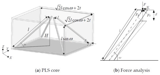 where l is the length of the member, as shown in Figure 4a,b, l = H/sinω. A is the area of the bottom surface of the PLS core, ; D is the diameter of the member; t is a small spacing between two members at the top wall of the PLS core and also was a small spacing between one of side walls of the PLS core and the member at the bottom wall of the core.