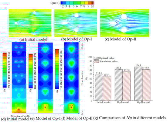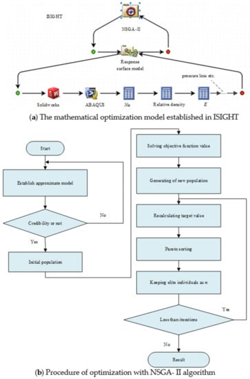 The optimization model for the PLS and KLS was built by ISIGHT2018. Figure 5a shows that models of PLS and KLS cores were established by SOLIDWORKS; the value of freq1 was calculated by ABAQUS; and Nu, , E and σ were directly calculated by their equations. Herein, the heat transfer and mechanical performances of the LS channel were mainly investigated. Moreover, in future study, the pressure loss, porosity and friction coefficient of the LS channel might be added at this optimization model.