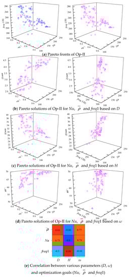 In the optimization model, the most important task was to establish the mathematical calculation expressions for these objectives (Nu, freq1, E and ). According to reference [], these objectives were dependent to geometric variables (D, H and ω). Some expressions of these relations were derived as follows.
