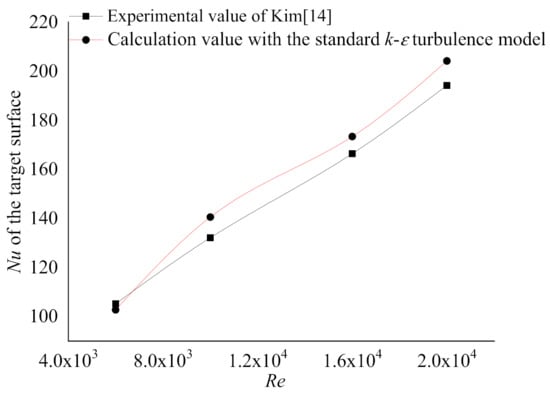 It can be observed from Figure 2 that with the increase in Re, the trend for the growth of Nu was consistent with the experiment value of Kim [] and the calculation value of the cooling channel with the fin method based on Equation (19). Meanwhile, the maximum error between the calculated value with the fin method and the experiment value of Kim [] was about 17%; therefore, the given function of Nu was considered to be reliable with the uniform trend line. Furthermore, compared with five LS cores, when 10 LS cores were set, the average Nu decreased by 23.1%; when 15 LS cores were set, the Nu decreased about by 47.9%. Therefore, five LS cores were set in the flow direction of the cooling channel to reduce its overall size. According to reference [], pressure loss increased gradually with the increase in Re. However, when Re reached up to 10,000, pressure loss was only about 300 Pa in the LS channel. In addition, changing the D, H and ω of a single LS core had a small effect on the change of pressure loss of the cooling channel. Therefore, pressure loss was not investigated further in following research.