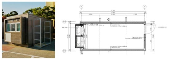 The experiment was conducted using a modular house with an external envelope that included a simple balcony as a test bed. The modular house was installed in front of Engineering Building 1 at Erica Campus, Hanyang University, which is located in Ansan, Gyeonggi-do. The modular house with a floor area of 14.6 m2 was installed as in Figure 1. An external envelope package containing a double envelope that served as a simple balcony with a depth of 0.600 m was installed. The house was installed so that the windows faced southward and the house was placed on a support that elevated the entire structure approximately 0.600 m from the ground. The house was in the form of a box-shaped building with a rectangular floor measuring 3.300 m × 7.320 m, a ceiling height of 2.400 m, and a floor-to-floor height of 2.850 m. The walls, floor, and ceiling were insulated with two 100 mm Polyisocyanurate form (PIR) panels. The interior of the four walls was finished with metal sheeting, and the floor was finished using wood panels. The ceiling has 0.200 m of air space and gypsum board was used as the ceiling material. Since it was installed on a 0.600 m high support, the floor was not in direct contact with the ground. Installed on a 0.60 m high support meant that the floor was not in direct contact with the ground, and the floating floor area under each wall was finished with insulation, thereby minimizing the possibility of air infiltrating through the building floor and any associated temperature changes. The air-to-air heat pump system (model name: CSV-Q115B) by Carrier, which is capable of both heating and cooling, was installed to measure the amount of energy consumed. The cooling/heating capacity of this unit is 4600/5600 W and the power consumption is 1.58 kW for cooling and 1.65 kW for heating. The rated COP for this pump is 2.91 for cooling and 3.34 for heating. A meter was used to measure the energy consumed by this air conditioner during the experiment.