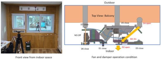 The experiment for verification of the model using ACH was conducted by operating the bypass mode of the air cleaning ventilation system. All dampers other than D7, which was connected to the exterior, and D6, which was connected to the interior in the lower right corner (Figure 3), were closed, and external air was introduced by operating the M3 motor between these two dampers. Air from the cavity space cannot enter the room under these conditions, and only air from outside enters the room. The building is not affected by wind because the front, left and right, and the rear of the test bed are surrounded by buildings and woods. This means that no air infiltrates the building other than that introduced by the fan.