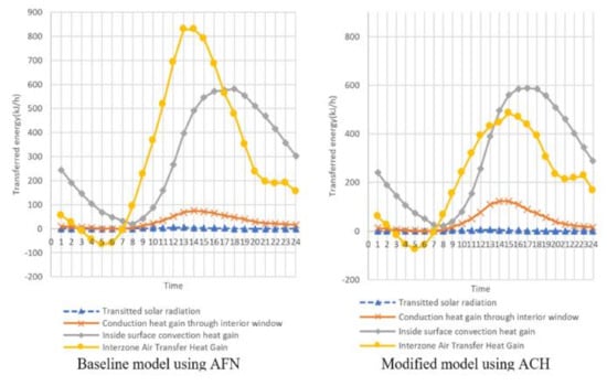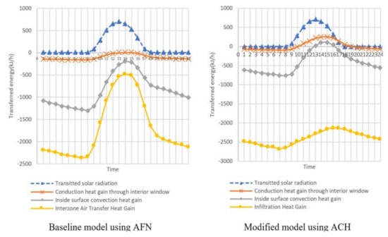 Figure 5 illustrates the heating load in the winter season. Since most of the heat transferred through the wall is in the form of heat loss, the sign is negative. On the other hand, in Figure 6, the sign of heat gain is positive, as heat is transferred indoors during the summer. The temperature of the interior surface in the residential area was higher using the ACH method than it was under the baseline model using the AFN method. This is because the discharge air temperature of the ideal load system is higher in the model using the ACH in which heat loss is larger due to infiltration. Thus, the amount of convective heat transfer occurring through the wall is lower in the model using the ACH method. The heat that is transferred via conduction from the balcony to the residential area through the interior window at night is also lower in the ACH model, for the same reason.