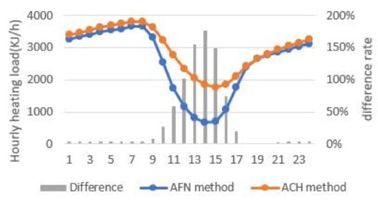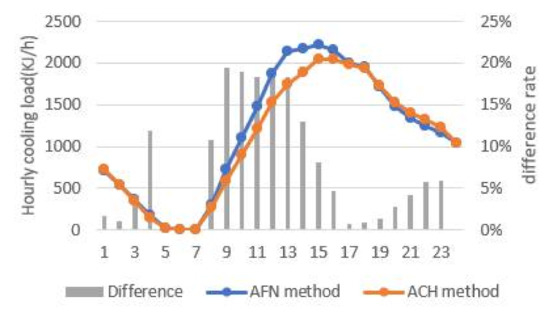 Figure 7 shows a comparison of the heat gain difference between the two models during the cooling design day. The difference between the cooling and heating load in the model using the ACH method and the model using the AFN method is expressed as a percentage. The difference was calculated using the following equation: