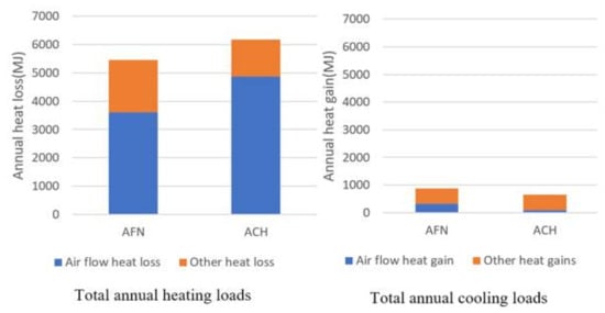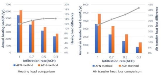 Figure 10 compares the calculation results of the model using the AFN method and the model using the ACH method. The right side shows the difference in heat loss that is due to air flow, while the left side shows the calculated difference in the annual heating load. The annual heating load is the sum of the heat lost via air flow and other forms of heat loss.