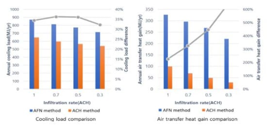 In terms of the cooling load, the effect of decreasing the heat gain ratio via air flow in the cooling load that results from a reduction in infiltration rates decreases as compared to the effect of the increased difference in the calculated heat gain via air flow in the model using the AFN method and the model using the ACH method. Thus, as shown in the left graph of Figure 11, the effects increase as the infiltration rate decreases and then decrease again. Figure 11 indicates that the difference in the calculated result of the annual cooling load using the AFN method and the ACH method increases to 34% at 1 ACH and 35% at 0.7 ACH, and then decreases to 30% at 0.3 ACH.