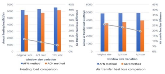 Figure 12 shows how the heating load and related heat loss that results from air flow differ in the model using an ACH method and that using an AFN method when the size of the window is reduced in 1/3 intervals. As the size of the window decreases, the inflow of solar radiation to the balcony decreases, and the temperature inside the balcony decreases accordingly. The difference between the temperature inside the balcony and the outdoor air decreases as the inflow of solar radiation decreases during the heating period. Accordingly, the difference in the effect of air flow in the ACH and AFN models, which was 26% with the original window, decreased to 19% when the window size was reduced to 1/3, as shown in Figure 12.