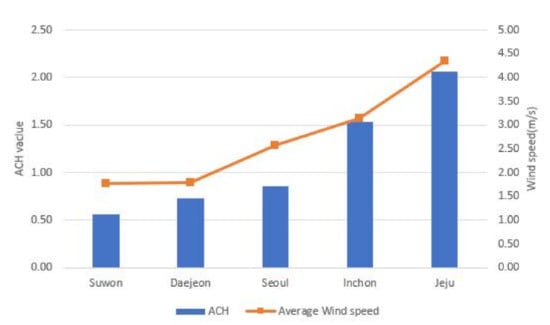This analysis involves changing the weather conditions while retaining the same modeling conditions and comparing the results gained using the AFN model with those from the ACH model. The data used for this analysis describe the weather conditions in Suwon, where the experiment was conducted; Seoul, which has the largest population in Korea; Daejeon, which is located inland; Incheon, which is located on the coast; and Jeju, where the highest average wind speed occurs in South Korea. Figure 14 shows the annual average wind speed in the five cities and the annual ACH when the weather files of each city are applied to the model using the AFN method. The annual average infiltration rate increases as the average wind speed increases.