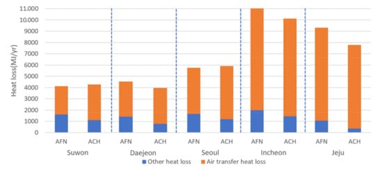 As the ACH value increases, the heating load increases. However, in the case of Jeju, the average temperature is higher than in other inland cities as the climate in this city is almost subtropical. The average temperature over 30 years of climate data in Suwon, Seoul, Daejeon, and Incheon is approximately 11–12 °C, while in Jeju it is 15.5 °C, which is more than 3 °C higher. Thus, the heating load is smaller than Incheon although the value of ACH exceeds 2.