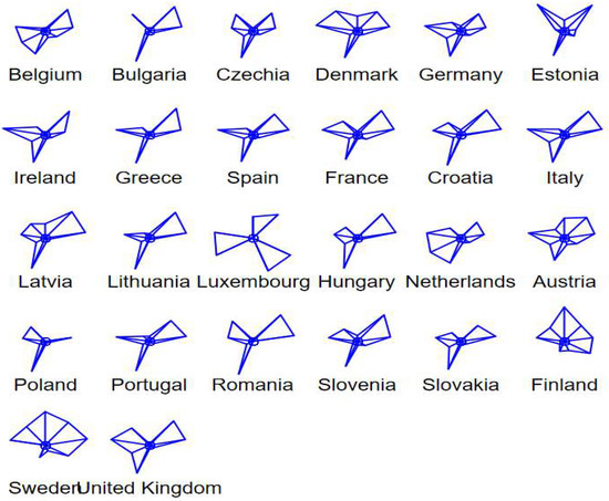 As presented on the star chart, for example, Sweden and Finland are the most similar to each other, but Luxembourg is an outlier among other member countries. Another group of similarities can be identified for the following countries: Romania, Latvia, Slovenia, Lithuania, Greece, Hungary, and Croatia. The next group are the UK, France, Italy, Portugal, Spain and Estonia, Bulgaria, Poland, Slovakia, and Czechia. The next group of graphically similar countries are: Austria, Denmark, Ireland, Germany, The Netherlands, and Belgium. Graphical interpretation of data is a preliminary stage to the agglomeration procedure.