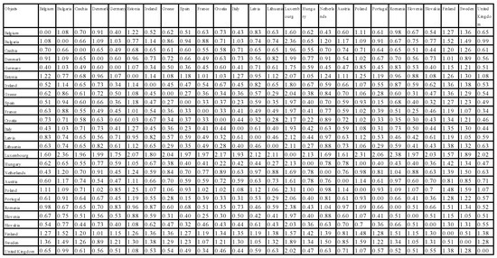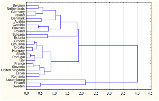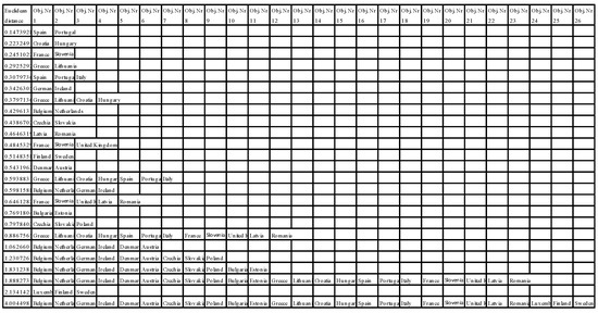 Figure 4 shows the data of the agglomeration process. The first column presents the Euclidean distance values of the objects in order from smallest to greatest value and the result of the subsequent grouping steps. Clusters of the countries the most similar to each other were created in the beginning, e.g., Spain and Portugal (Euclidean distance 0.1473928), Croatia and Hungary (Euclidean distance 0.2232429), France and Slovenia (Euclidean distance 0.2451022), Greece and Lithuania (Euclidean distance 0.2925292), and Poland, Slovakia, and Czechia (Euclidean distance 0.7978403). Next, the first smallest clusters were joined with subsequent countries into larger groups depending on the measure of similarity, which was a measure of Euclidean distance. The Euclidean distance matrix is presented in Figure 5.