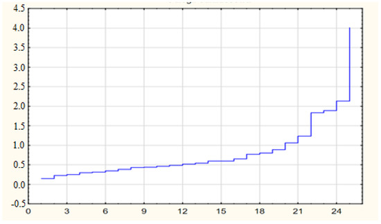 Figure 6 shows binding distances relative to the binding stages. This graph shows the distance between the combined/connected groups at each step. As shown, the distances needed to connect the two groups slowly increase up to the 25th step, where there was a very significant increase in the distance (almost two-fold). On the basis of Figure 6, it can be seen that the decision to cut the dendrogram at the segment of the agglomeration distance [1.1; 1.3] was justified.