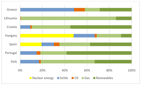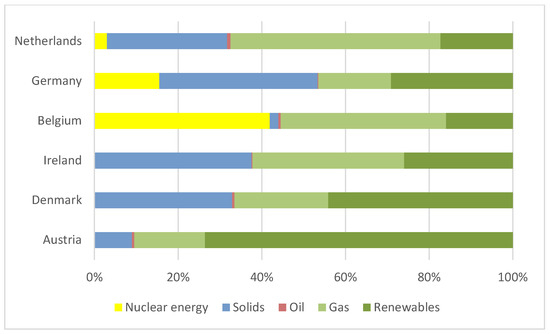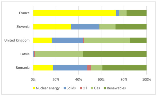 The most crucial factors that appeared in the identified clusters were: the location of the country, the climate, the cooperation in a region, the electrical power systems, which are linked to the similar structure of the energy mix, and also the use of renewable sources of energy. The characteristics of energy mixes having great influence on the level of development of energy markets are shown in the charts for the six selected clusters of similar countries (Figure 7, Figure 8, Figure 9, Figure 10 and Figure 11).