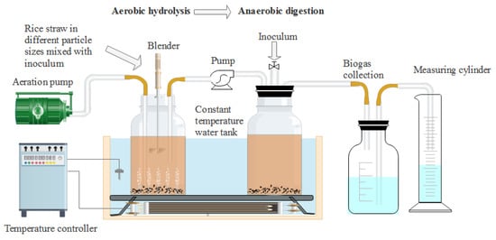The experiments were divided into four groups: particle 1, particle 2, particle 3, and particle 4, corresponding to the treatment of crushing through 1, 3, 5, and 7 mm sieve sizes, respectively. 80 g milled RS of each group and 880 g aerobic inoculum (66.67 gVSadded) were thoroughly mixed and added to a 2.5 L hydrolysis and acidogenic reactor to adjust the TS to 8%. The blank group was not filled with rice straw and was added with the same amount of inoculum. The gas production of the blank group was deducted when calculating the gas production of different particle size groups. Air was injected into the above groups at a flow rate of 0.75 Lmin−1. The hydrolysis-acidogenic reactors were placed in a shaking water bath at 35 ± 1 °C for 24 h in triplicates to produce VFAs. A small amount of samples were taken to measure the pH value, VFAs contents, VS, degradation of lignocellulose, reducing sugar and microbial composition to evaluate the characteristics of aerobic hydrolysis-acidogenic process. The remaining substrates were transferred to the methanogenic reactor by the pump for subsequent AD experiments in a batch mode after 24 h. The experimental device used in this study was shown in Figure 1.