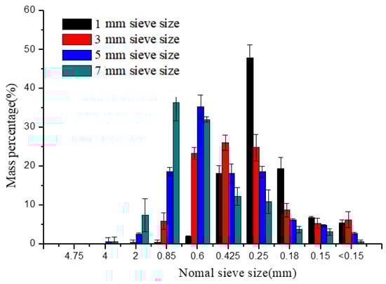 The percentages of particles retained on different-sized sieves of different groups were shown in Figure 3. As can be seen from Figure 3, micro-particles (<1 mm) accounted for more than 90% of the whole particles. The PSD was normally and logarithmic normally distributed as the previously reported [27]. The peak gradually moved backward when the sieve sizes were changed from 7 to 1 mm, illustrating that finer particle sizes were obtained. The most distributed particles were 0.85–2 mm and 0.6–0.85 mm at 7 and 5 mm sieve sizes, respectively. Whereas the mass percentages of 0.25–0.425 mm, 0.425–0.6 mm, and 0.6–0.85 mm particles had relatively small differences in the 3 mm sieve size group. The 0.25–0.425 mm particles accounted for 47.82% at the 1 mm sieve size showing that the particle sizes were in a narrower range than other groups.