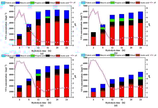 pH and VFA are two interrelated indicators that reflect the degree of hydrolysis and acidogenesis processes [28]. The changes of pH value and VFAs at different times in the aerobic hydrolysis and acidification process were shown in Figure 4. In comparison with the initial pH, the pH values of all groups showed a rapid upward trend in the first 4 h, which was speculated that the growth rate of protein ammoniated bacteria was higher than that of acid-producing bacteria, leading to higher production of alkaline substances and lower VFAs content. The above assumptions were also confirmed by the increase of Proteobacteria in the next part of the microbial community analysis. S. Montalvo et al. also proved that this pH increase could be explained by the generation of ammonia from hydrolysis of protein during the aeration phase [29]. Over 4–12 h, a large amount of hydrolyzed products were converted to volatile fatty acids resulting in a sharp drop in pH. After 12 h, the pH was basically stable between 5 and 6. As the particle size decreased, the pH value also decreased because more usable lignocellulose could be effectively converted to VFAs by the aerobic acid-generating bacteria.
