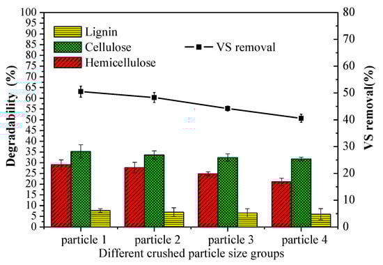 - The particle size had a significant impact on the degradation of cellulose, hemicellulose. The methane yields were improved as the particle size gradually decreased. The 1 mm sieve size group enhanced the methane yield by approximately 6.26%, 17.53%, and 27.65% in comparison with 3, 5, 7 mm sieve size.