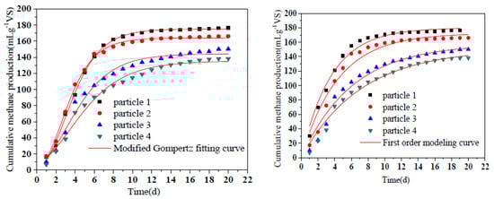 The modified Gompertz equation was used to fit the methane production of different particle sizes in the aerobic and anaerobic digestion shown in Formula (4) [20]