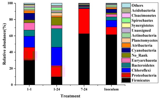 Relative abundances of phylum in each sample; 1–1 represents for particle 1 group at 1 h hydrolysis time; 1–24, 7–24 represents particle 1 group and particle 4 group at 24 h hydrolysis time, respectively; inoculum represents the aerobic inoculum.