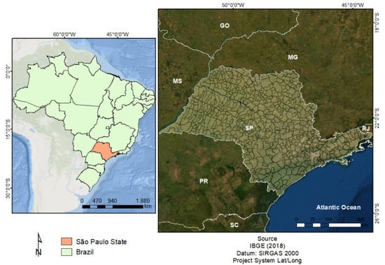 The study area is the São Paulo state, which is located in the southeastern region of Brazil. It borders the Atlantic Ocean to the east, Paraná state to the south, Mato Grosso do Sul state to the west, Minas Gerais state to the north, and Rio de Janeiro state to the northeast (Figure 1). São Paulo state has 645 municipalities in an area of approximately 248,000 km2. It had an estimated 45.9 million inhabitants in 2019, and it is the most populous state in Brazil [32].