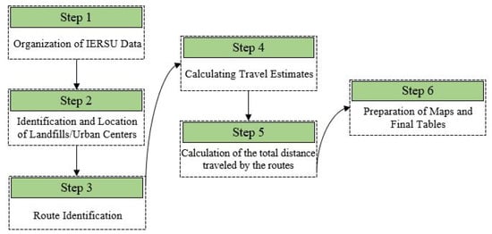 The methodology used was based on [24] and other similar articles that focused on the MSW collection and transport approaches in a GIS environment. Some examples are [10], which applied linear programming and GIS methods to optimize the routes for MSW collection and transportation for a municipality in Turkey, and [36], who carried out a study in Algeria to optimize the household waste collection. The steps used in our research are shown in the flowchart in Figure 2 and described later.