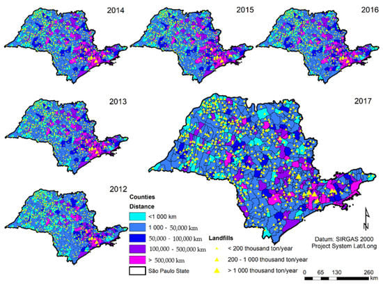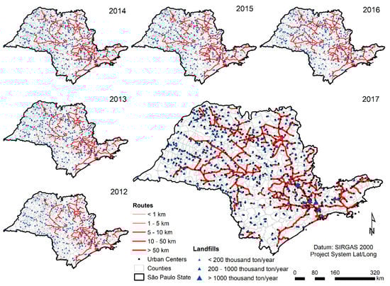 Finally, for the years 2012 to 2017, 646, 644, 645, 646, 644, and 643 routes were created, respectively. So, it was possible to estimate the distances between the urban centers and the final MSW disposal sites for São Paulo’s municipalities from these routes. The total results for the years under analysis were 1,468,000, 1,506,000, 1,676,000, 1,731,000, 1,764,000, and 1,997,000 km, following the chronological order of the years studied.