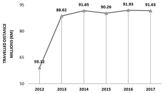 On the other hand, there is no significant variation in the number of municipalities that fall into class 50,000 to 100,000 km. The only years that there is more variation refer to 2013 and 2014. However, in general, the total distance covered was around 3 million km for almost all years. The class 100,000 to 500,000 km showed an increase of 26 municipalities and four million km of distance covered from 2012 to 2013. Between 2014 and 2016, these values remained very close, but in 2017, there was a substantial reduction.