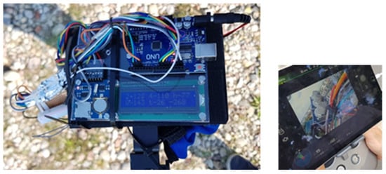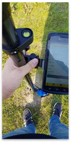 Multiple sensors in the sensor system allow the results between sensors to be checked in real time and reject incorrect readings or estimate the mean values between several sensors and apply sensor fusion and machine learning algorithms, thus avoiding incorrect measurements with cost-effective electronic components. One data line consists of the read resistances (analogue signal) from the MQ2, MQ4, and MQ135 sensors, and the relative humidity and the temperature (digital signal) from the DHT22 sensor with a time stamp calculated by the RTC module. The data string is saved to the SD card (4 Gb, speed class 10 used) using the RTC module in CSV format by creating a new file after starting the device or adding a new line at the end of the opened digital file. The HC-06 module pairs with the desired Android device and receives a data packet when streaming at a speed of 115,200 kbps to a mobile device (a Samsung S6 Edge + was used) running the Android operating system via a Bluetooth scanning application (the free application ArduTooth was used). During the experimental studies, the data were also transferred to the controller Spectra Precision MobileMapper 50 of the Spectra Precision geodetic GPNS receiver SP60 (Figure 4).