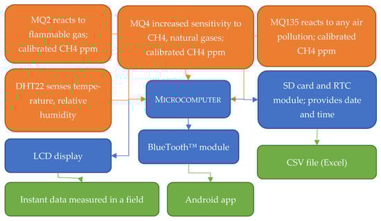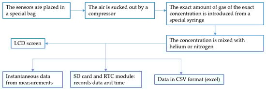 The main components of new sensor system are illustrated in Figure 2. The system consists of three modules: (1) gas sensors array (MQ2, MQ4, MQ135, DHT22); (2) system controller; and (3) measurement—data capture.