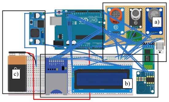 Arduino microcontroller with main block (approximate layout) (a) gas sensors (MQ2, MQ4 and MQ135) and temperature, humidity, and Bluetooth module; (b) real-time clock, SD card reader, and LCD; (c) current regulator and batteries.
