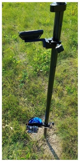 The main module of the sensor system consisted of an analogue of the open platform microcontroller Arduino Uno with a package of six AA batteries and a compatible cable connector attached to a metal plate using a holder for the GNSS receiver rod, which was fixed 20 cm above the ground (Figure 6).