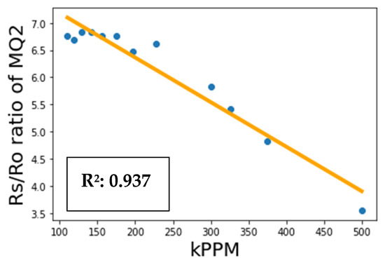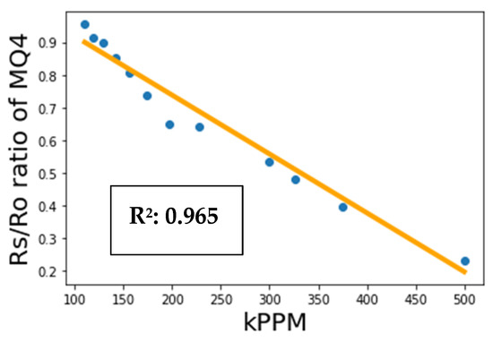 The “statsmodels” library was used to calibrate the MQ4 sensor, and Table 3 and Table 4 display the results of the created mathematical statistics, as shown in Figure 8.