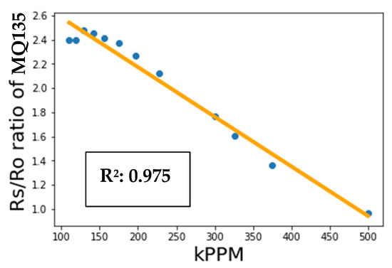 The values of each sensor were compared with the precisely known amount of gas through the linear regression equation for the calibration of each sensor. To derive the equation, a linear correlation between the parameters was calculated. The straight-line approximation of the true relationship was made. An important objective of regression analysis is to estimate the unknown parameters in the regression model; this process is also called fitting the model to the data [18,19]