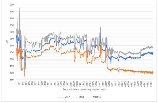 The data recorded by the MQ2 sensor showed a minimum value of 390 mV, a maximum value of 835 mV, an average value of 571 mV, and a standard deviation of 49 mV; the average of the 75% highest values was 615 mV. The data recorded by the sensor MQ4 showed a minimum value of 376 mV, with a mean value 493 mV, a standard deviation of 49 mV, and 75% of the highest values with a mean of 552 mV. The data recorded by the sensor MQ135 showed a minimum value of 396 mV, a maximum value of 879 mV, an average value of 616 mV, and a standard deviation of 52 mV; the average of the 75% highest values was 654 mV.