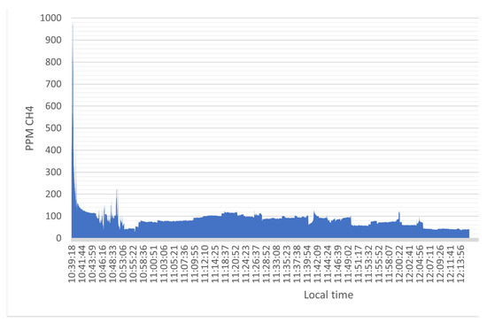 The values detected with a specialised methane gas sensor were converted from millivolts to ppm and are plotted in Figure 12.