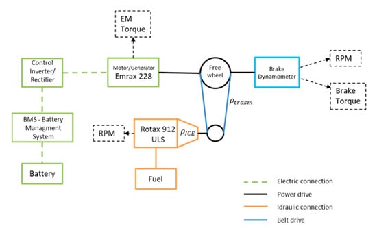 The ICE employed was the aeronautic, spark ignition, four-stroke engine Rotax® 912 ULS (BRP-Rotax Gmbh & co. KG, Gunskirchen, Austria) with an integrated gear box, . It is a four-cylinder boxer engine with two spark plugs for each cylinder. Its total capacity is 1354 cm3. Its maximum power is 73.5 kW at 5800 RPM and its maximum torque is 128 Nm at 5100 RPM. The EM (motor/generator) employed was the permanent magnet synchronous motor (PMSM) Emrax® 228 (EMRAX d.o.o. Molkova pot 5SI-1241 Kamnik Slovenia) low voltage. It has a maximum continuous power of 50 kW at 5500 RPM and maximum torque of 96 Nm. This data refers to the liquid cooled configuration, which has performances 15% lower than the Combined Cooled version. The employed battery pack is based on Li-ion cells. It has a nominal voltage of 74 V and a capacity of 3 kWh (~40 Ah).