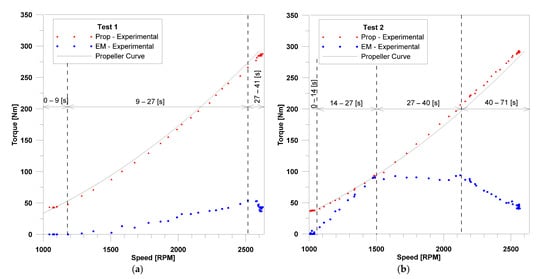 Experimental tests torque–rotational speed measurements: (a) Test 1; (b) Test 2.