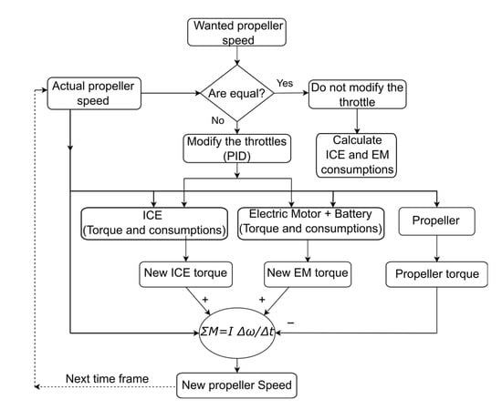 The proposed numerical model simulates hybrid electric propulsion systems that have a general scheme close to the one described in the previous paragraph. The freewheel can automatically de-couple the ICE whenever its power is not required. The EM is always coupled with the propeller, and it acts as a motor or generator depending on the power requirements; whenever the EM is not powered, it acts as a flywheel. The proposed numerical model can simulate every described case. In the most complex case (ICE and EM active), the model follows the logic scheme shown in Figure 3.