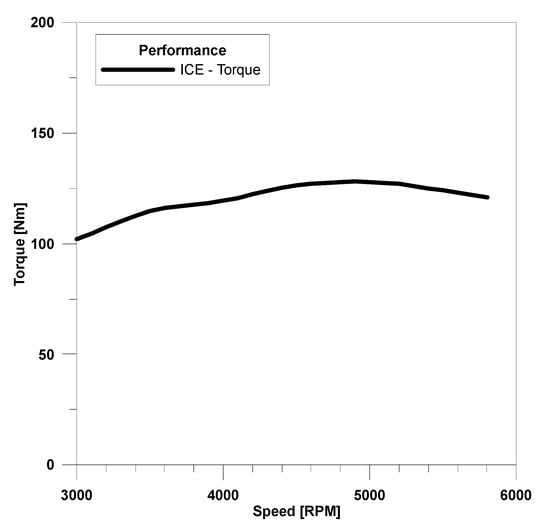 A simplified model describes the ICE. It cannot consider fluid-dynamic issues. Generally, the ICE torque () is a function of the rotational speed n, altitude H, and throttle position. The manufacturer provides the maximum engine torque as a function of rotational speed at sea level, and a correction map [19] to calculate the engine performance at different altitudes (H) at the International Standard Atmosphere (ISA). The manufacturer does not provide a relationship between torque and throttle position.